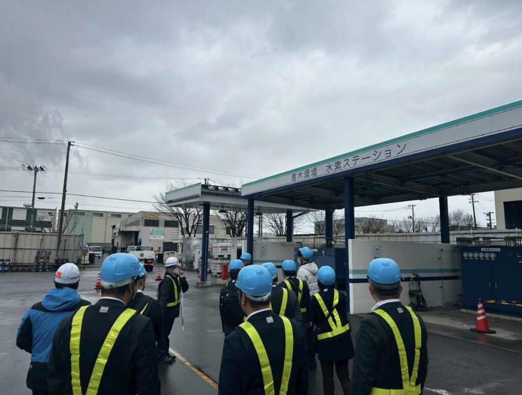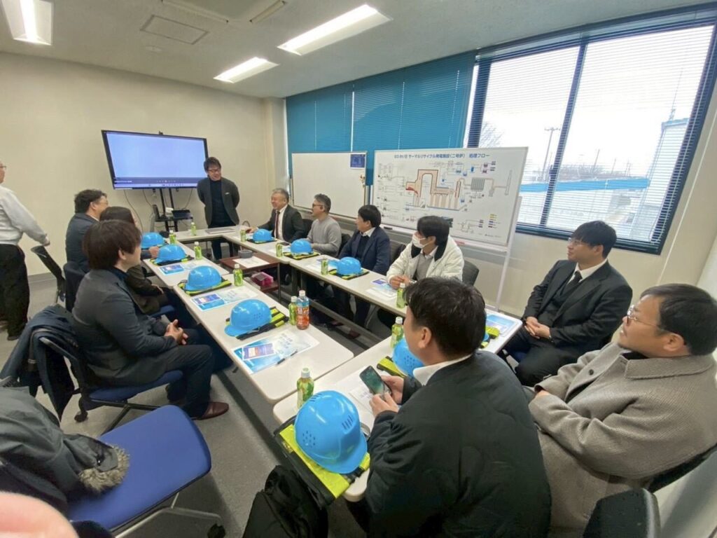 初めに、市川社長、東京営業部 青木様にご挨拶をいただき、会社紹介のムービーを視聴。その後、伊藤様にご説明いただきながら焼却施設や脱水施設、水素ステーションなどを視察しました。
